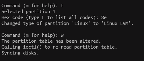 输入fdisk /dev/sdb,回车,然后输入m,回车,输入t,选择分区1,输入id值8e,输入w保存