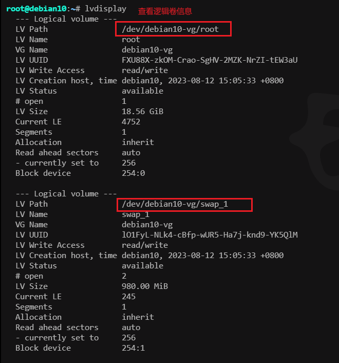 将debian10-vg卷组中空闲的5G分给/dev/debian10-vg/root逻辑卷, 使用:lvresize -l 1279 /dev/debian10-vg/root